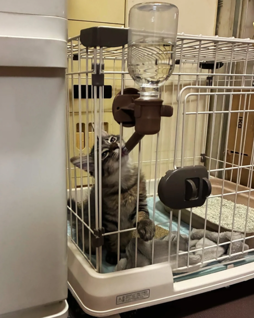 トムくんのトイレの砂かけがダイナミックすぎて水の中に入ってしまうため、我らがアイリスオーヤマさんの「給水ボトル」を設置しました。